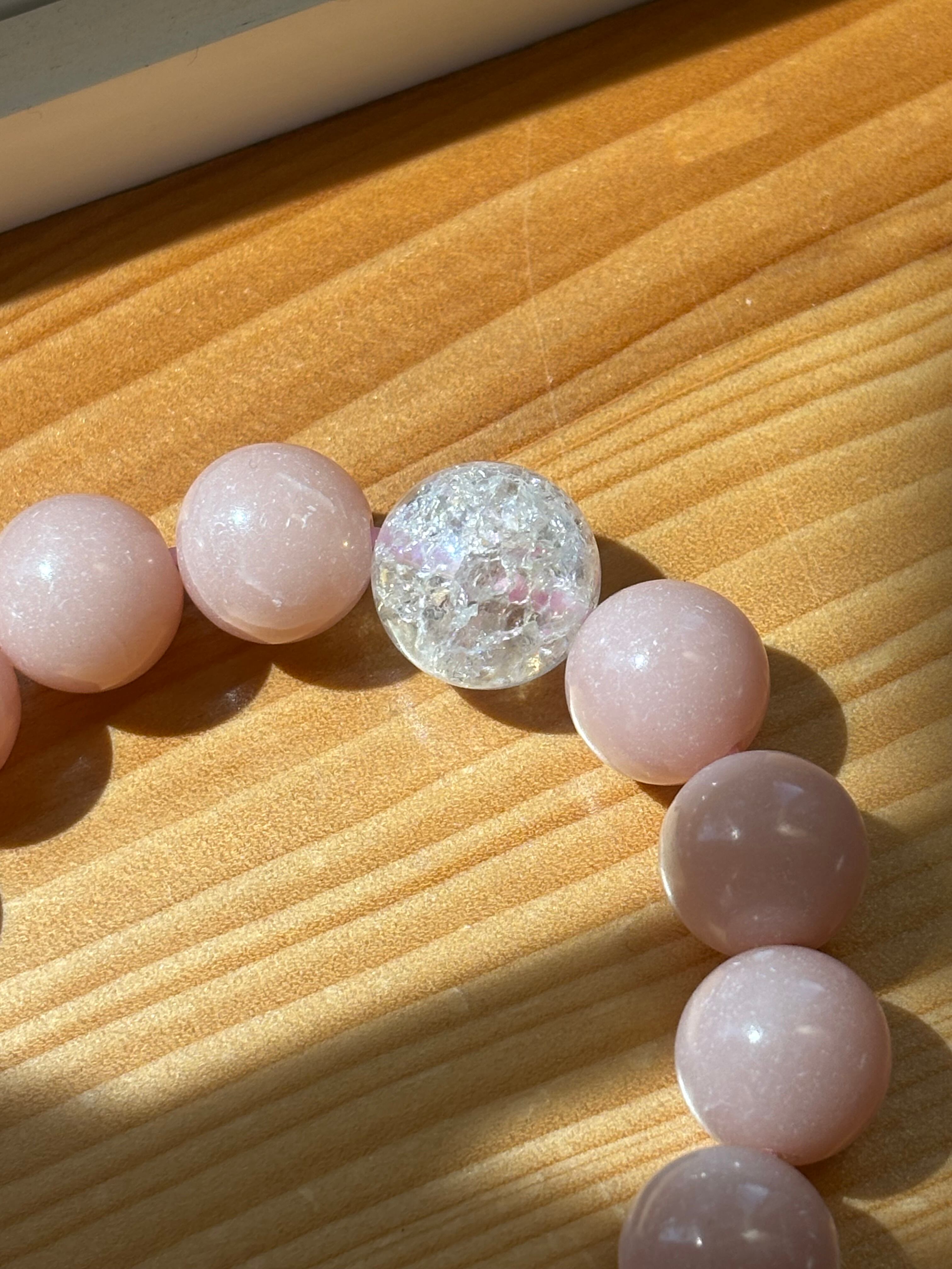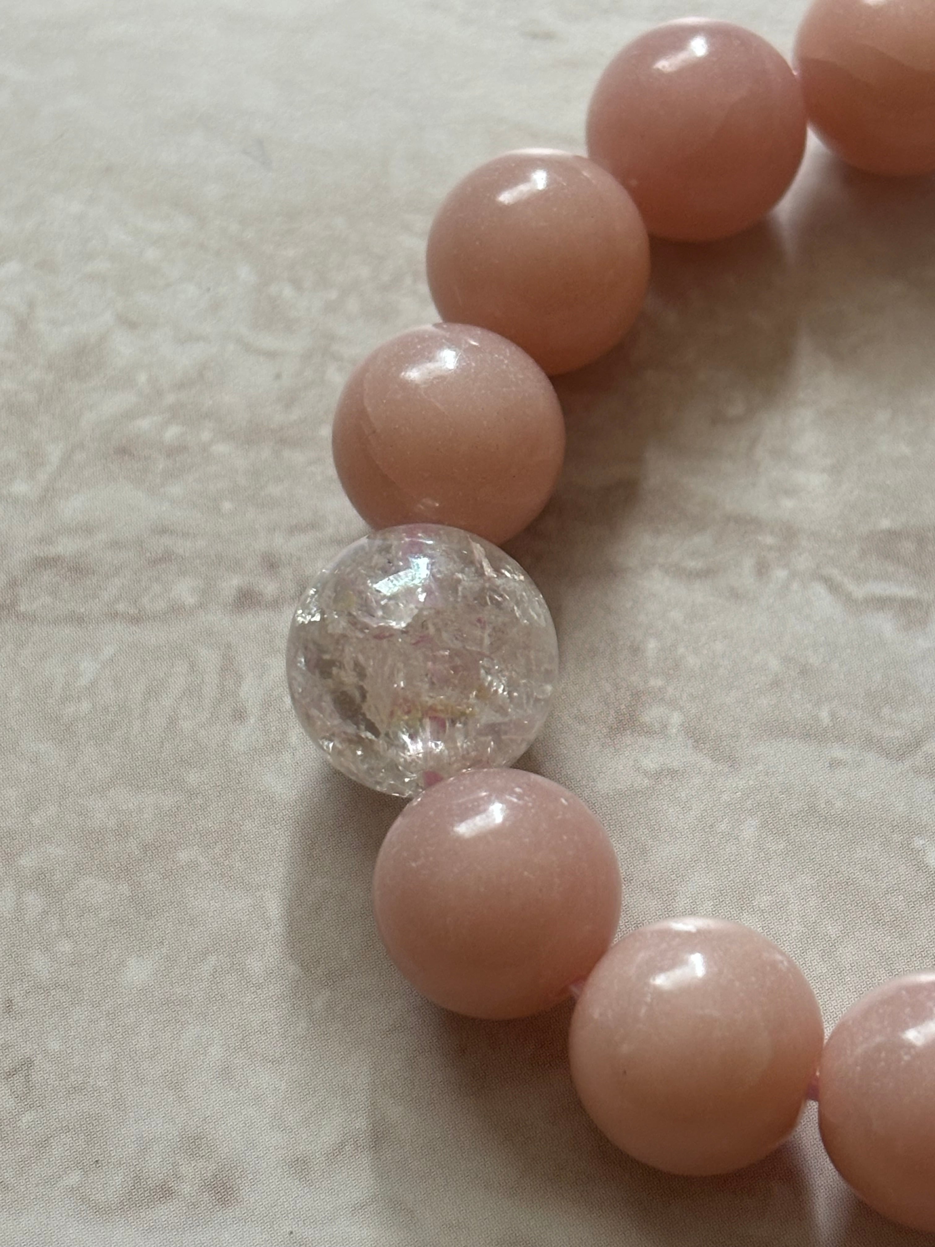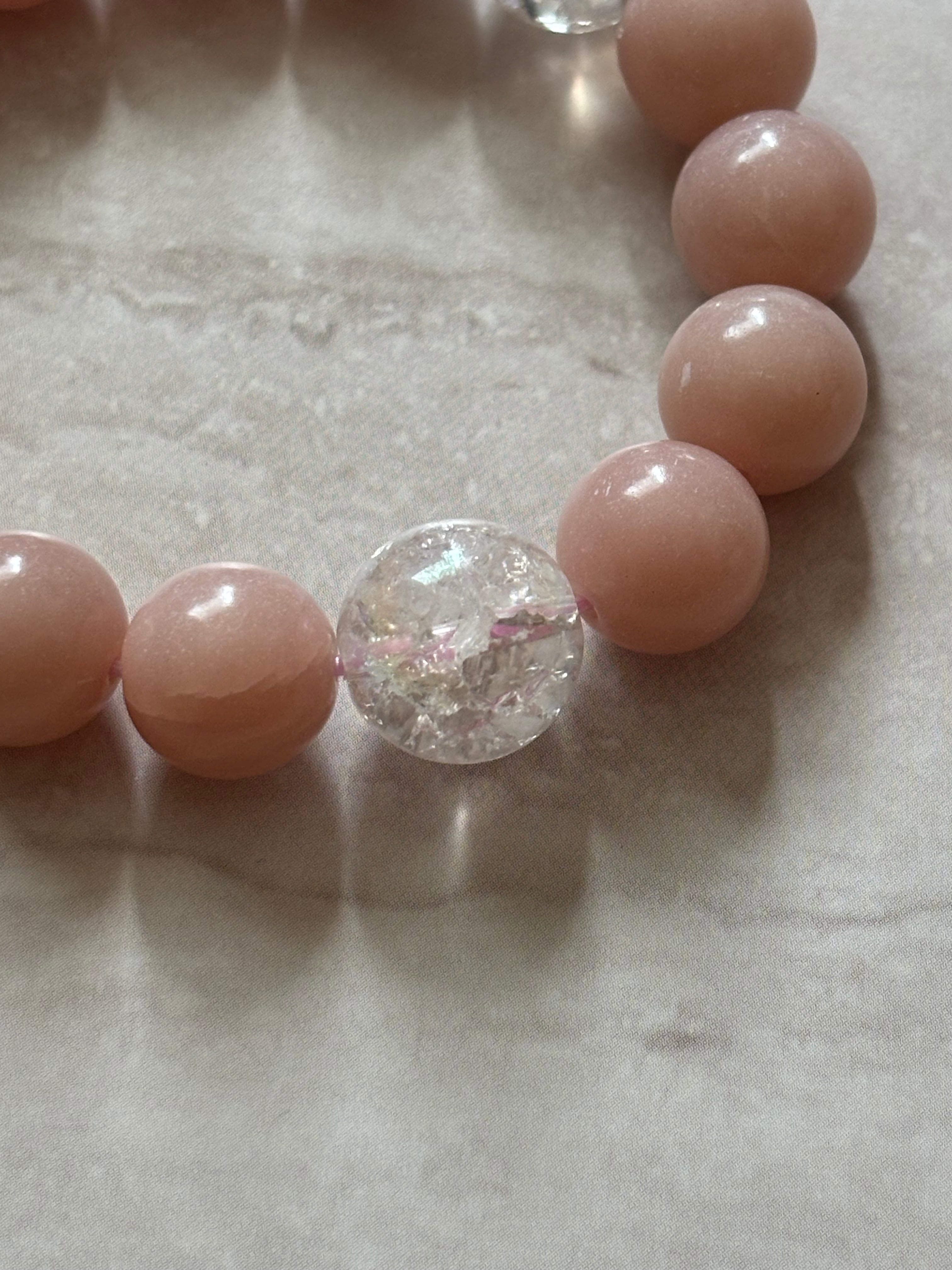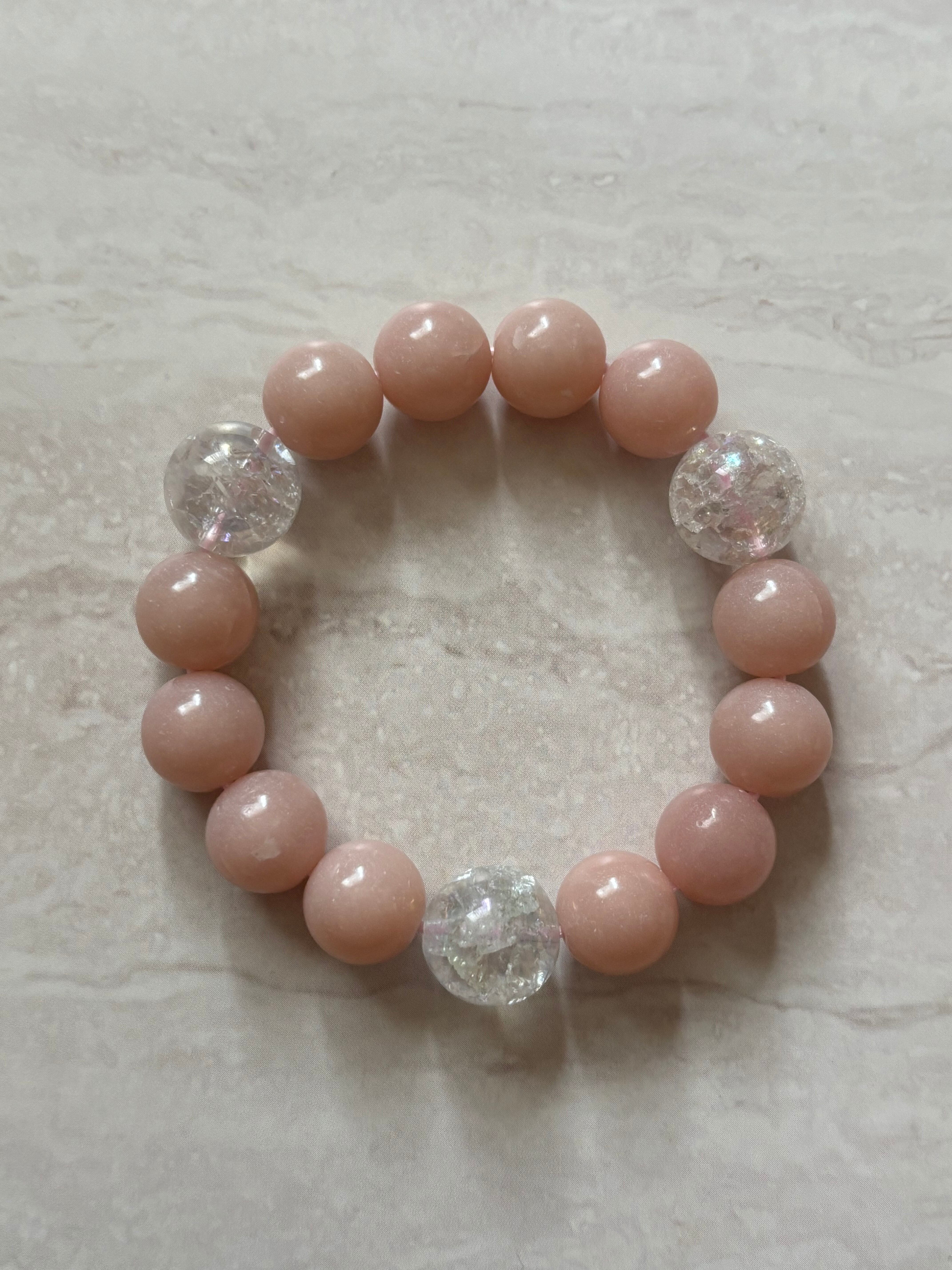 「愛」「調和」がテーマのブレスレットです。ピンクアラゴナイトは心を優しく包み込み、感情のバランスを取る手助けをしてくれます。一方、クラッククリスタルオーラは持ち主にポジティブなエネルギーをもたらし、内なる光を輝かせるサポートをしてくれる、そんな印象です。心を落ち着けたい時や、愛情を育みたいときにぴったりなブレスレットです。