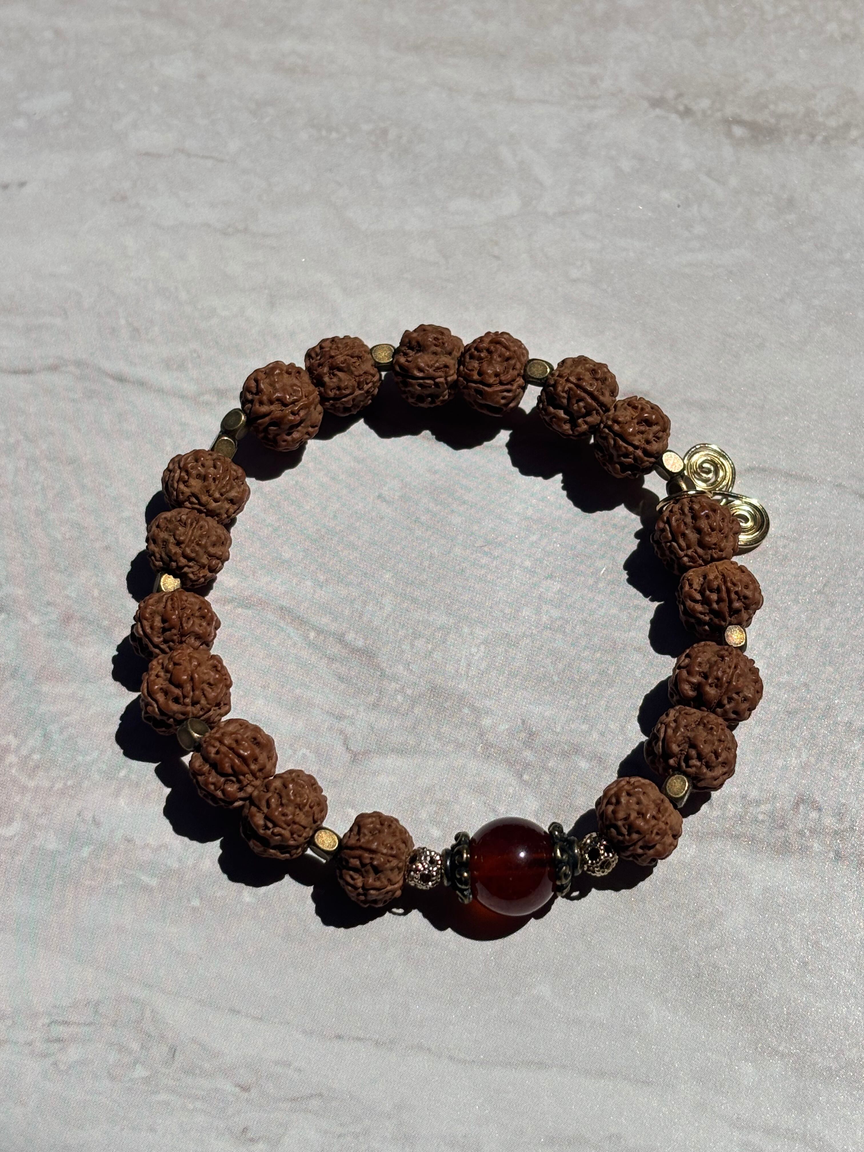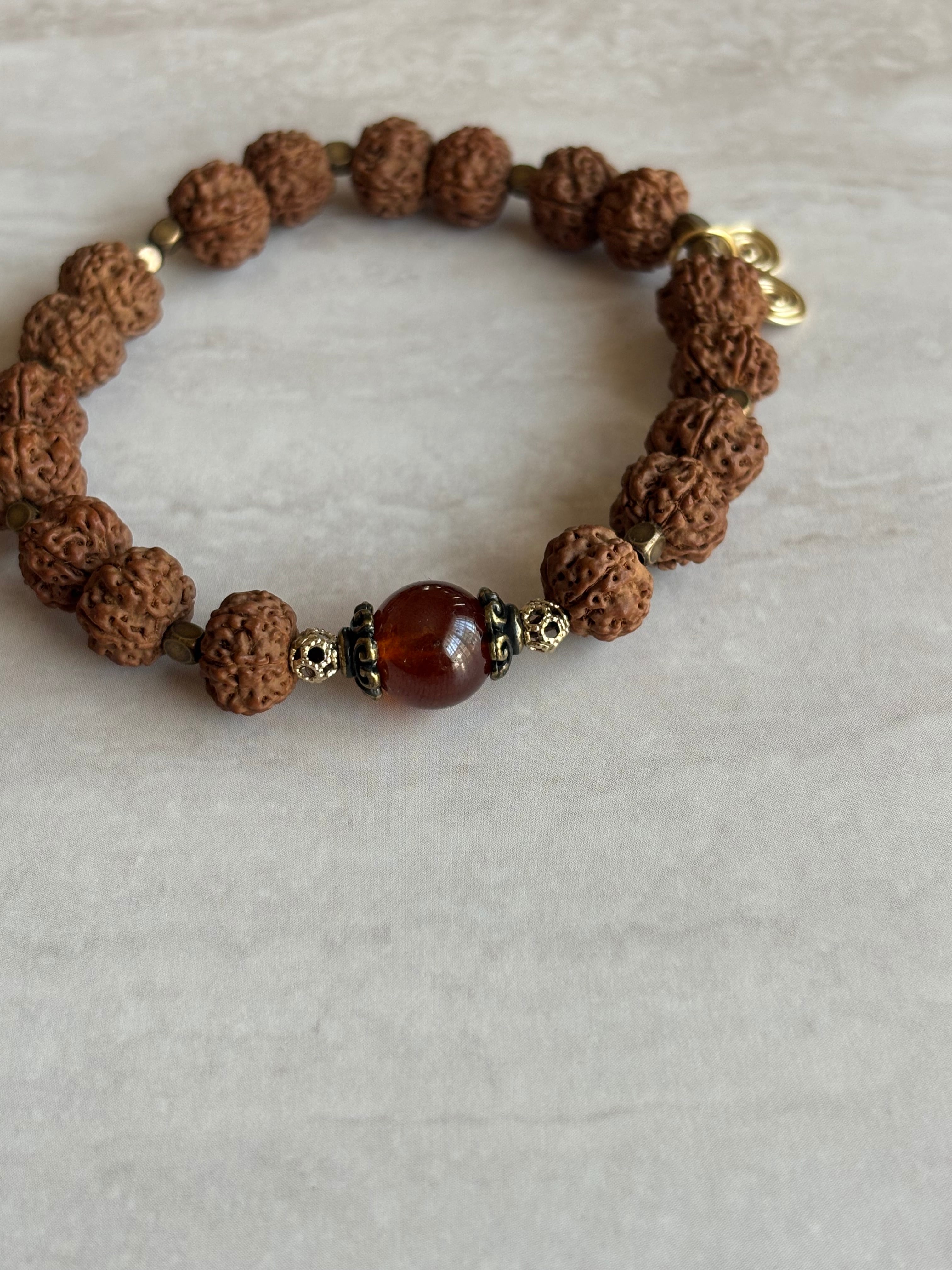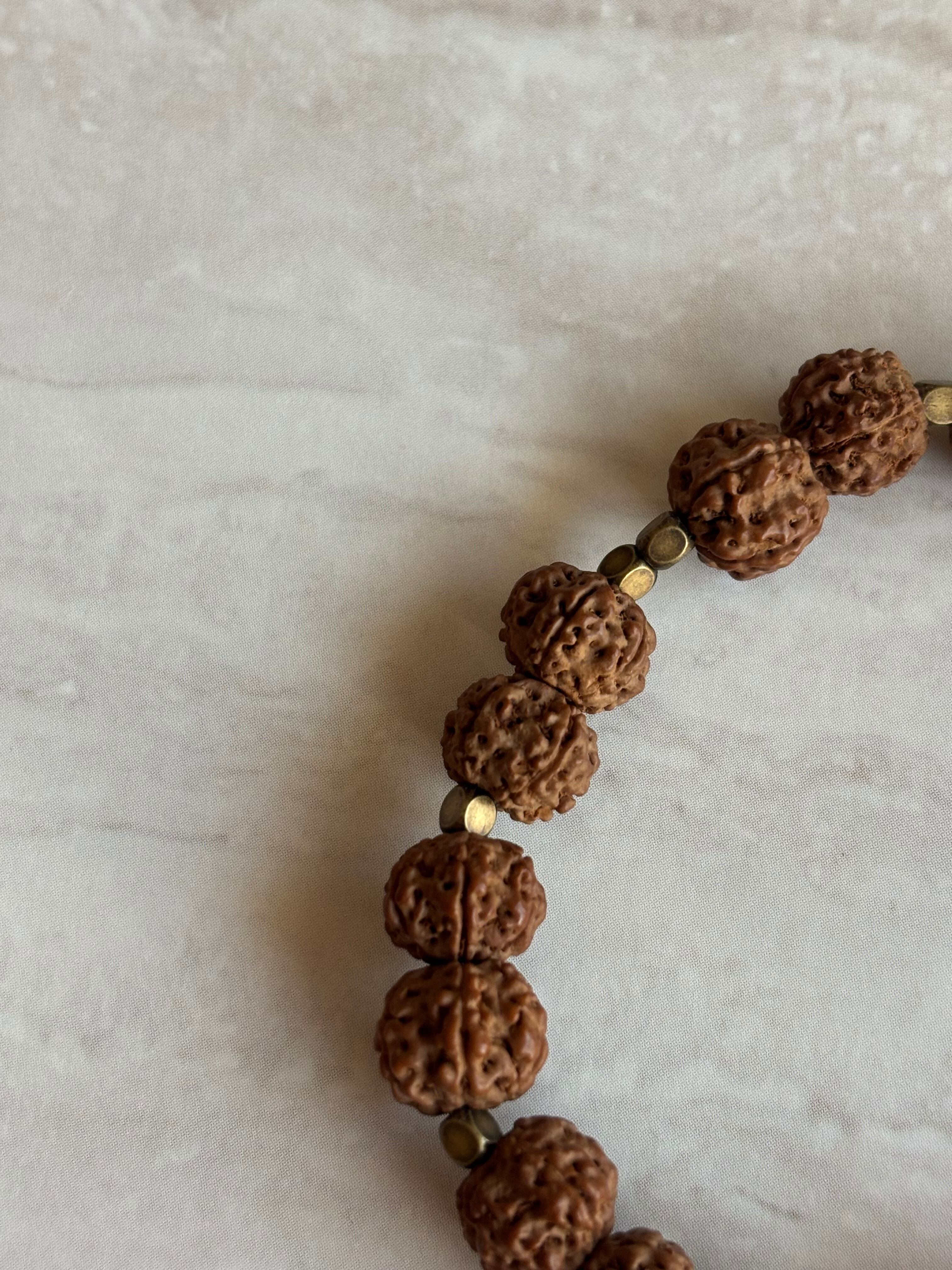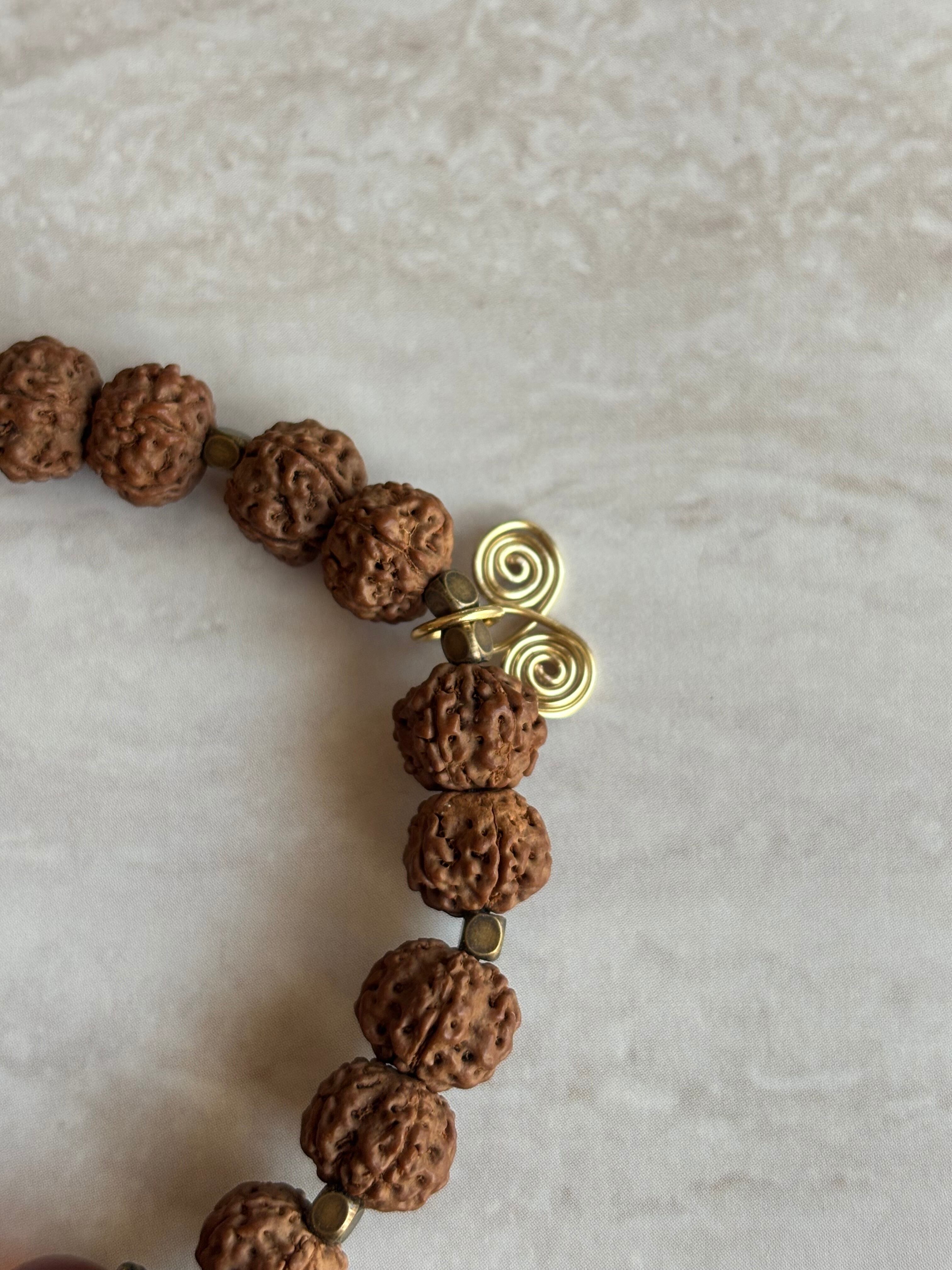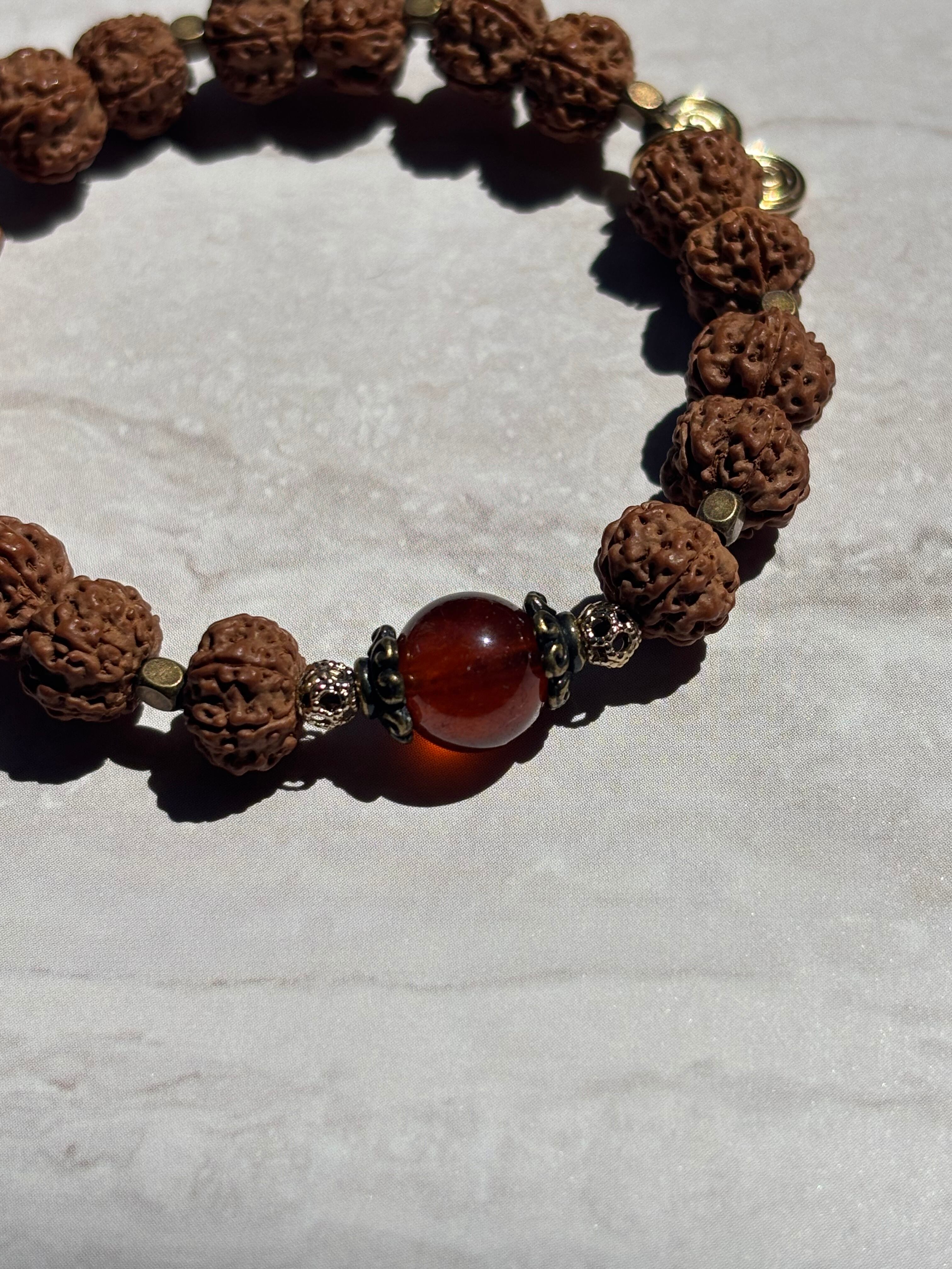 ルドラクシャの神聖さとヘソナイトガーネットの温かい煌きが融合し、心をゆったりと包み込む印象を与えます。