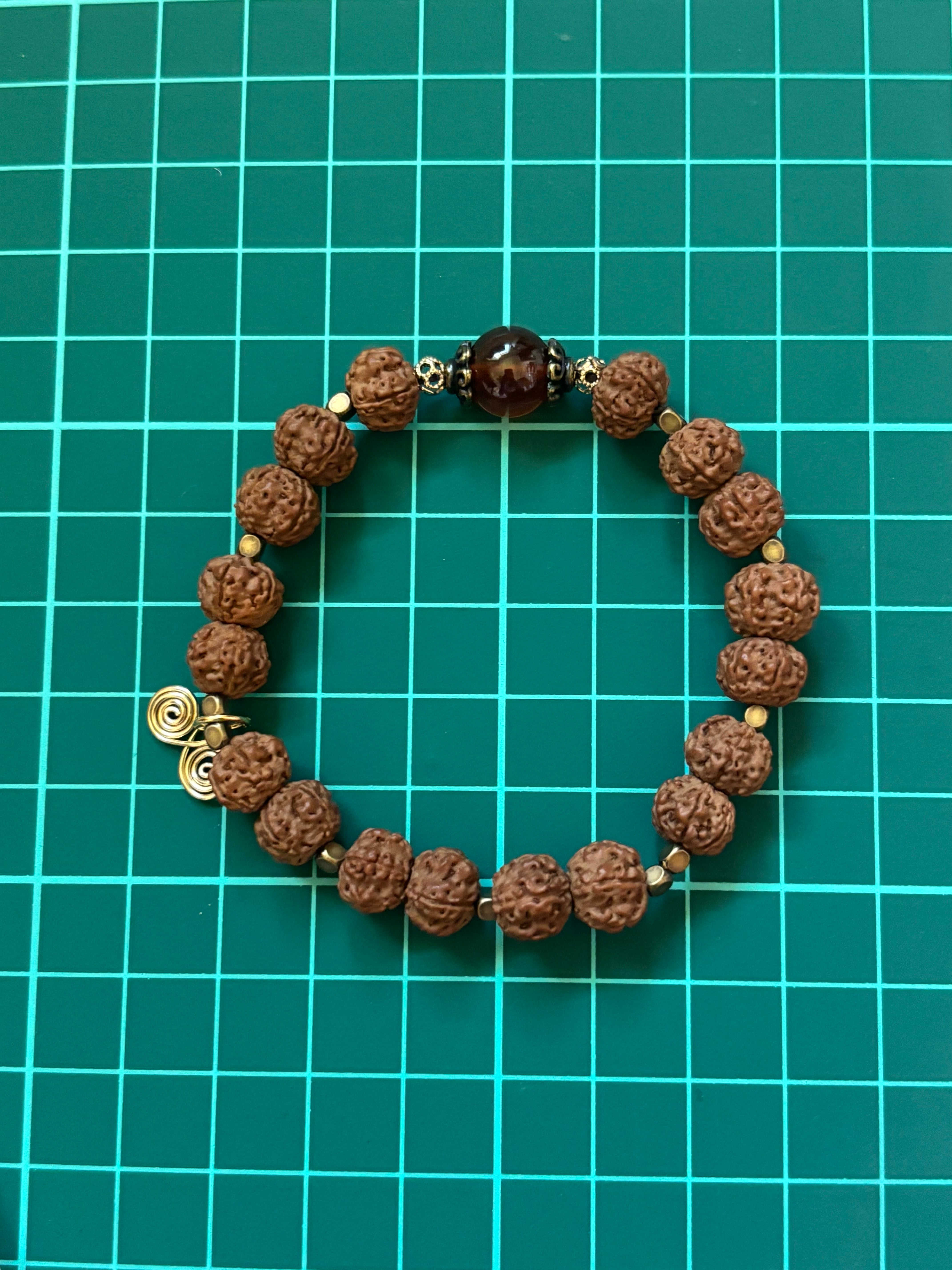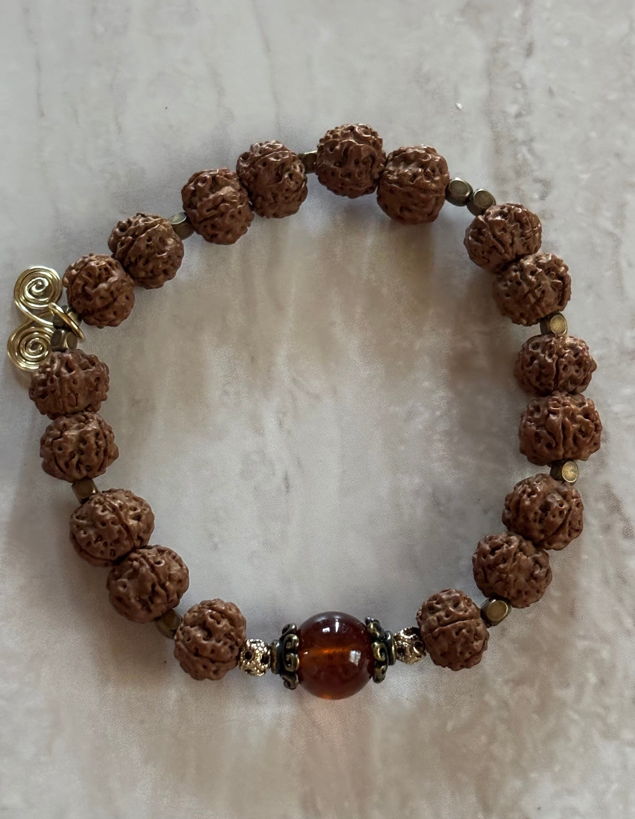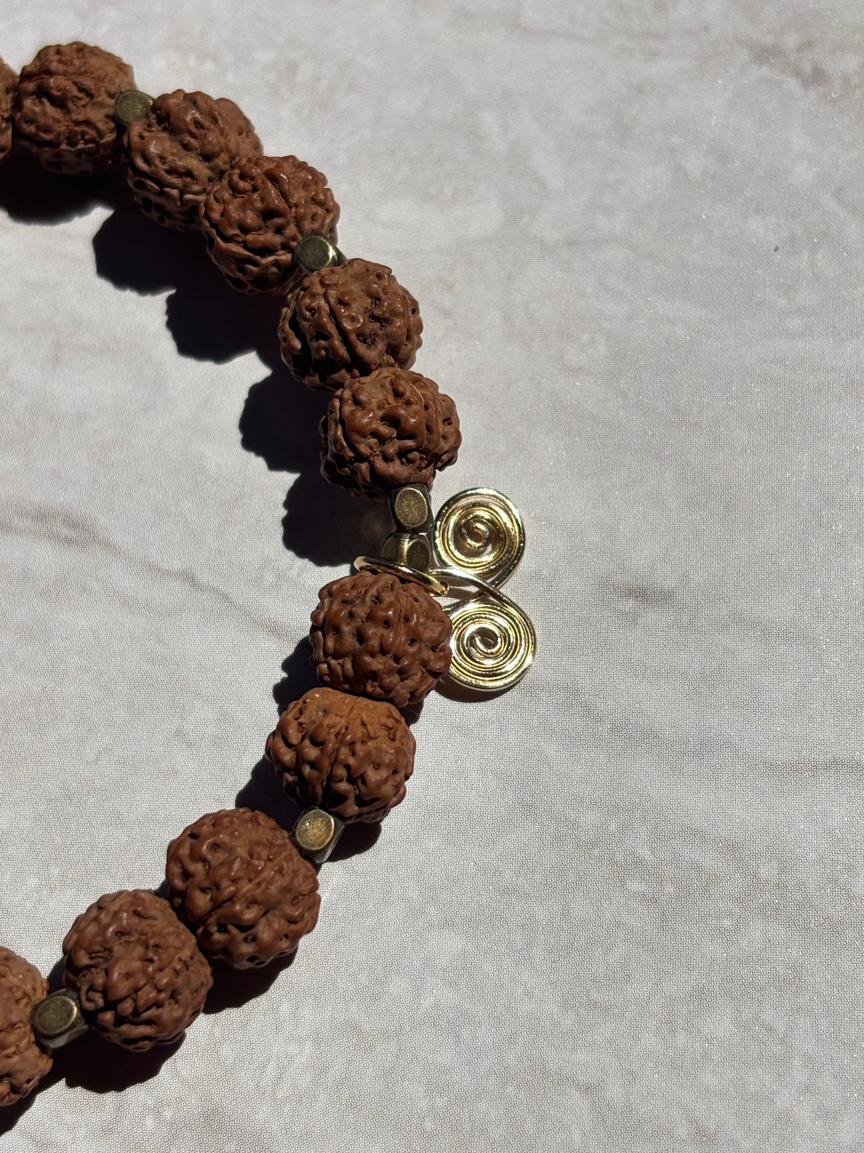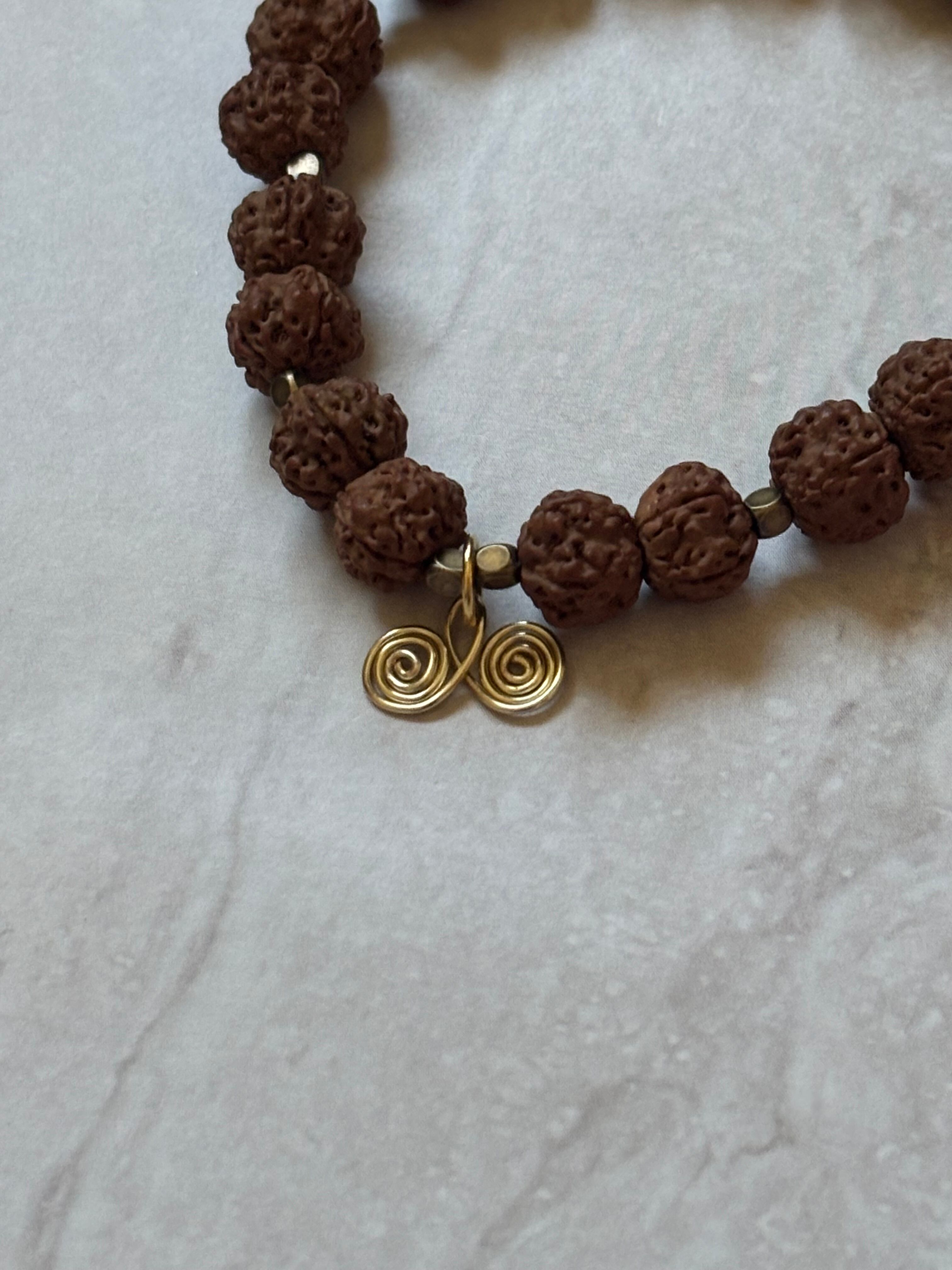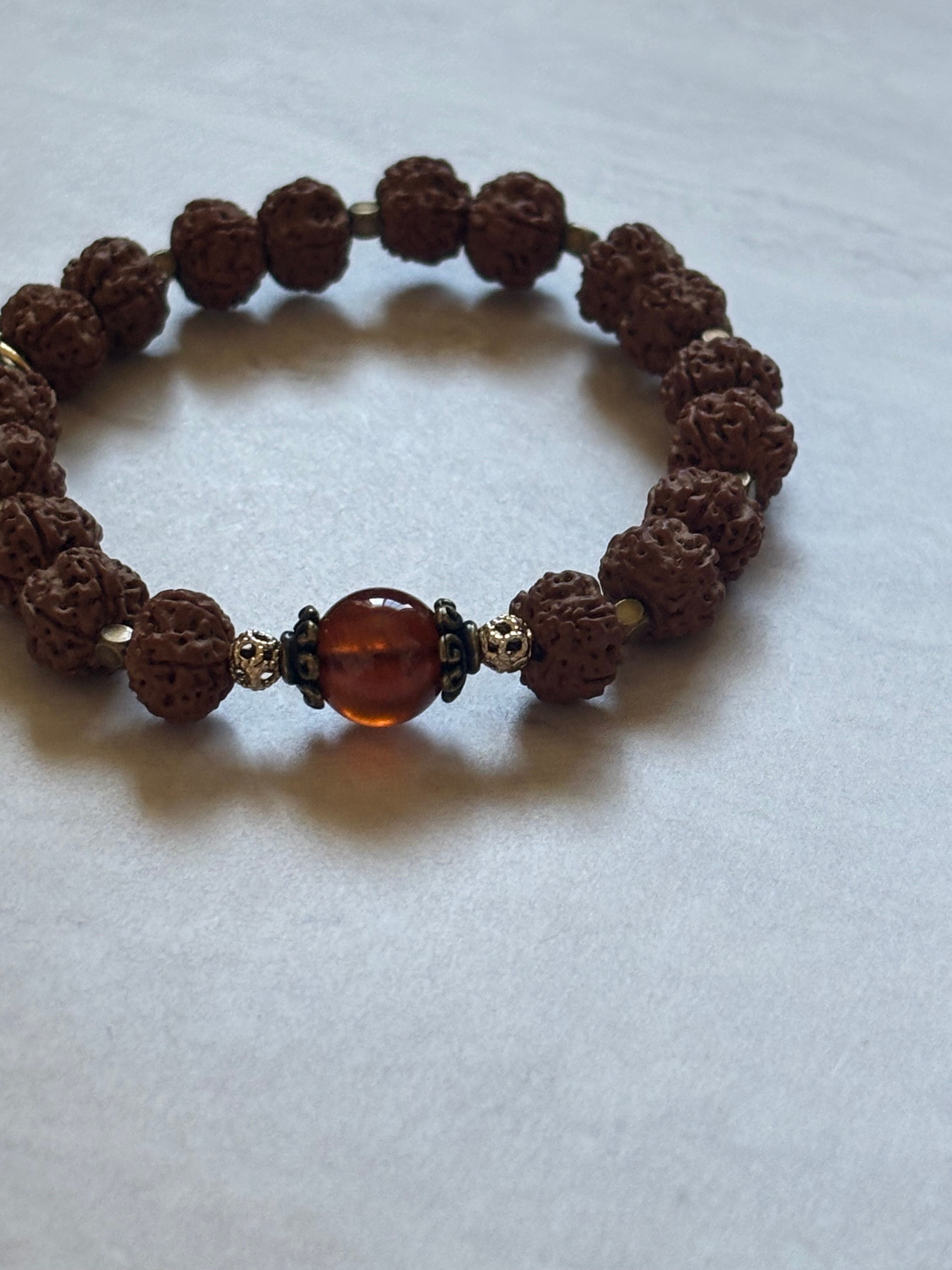 ルドラクシャの神聖さとヘソナイトガーネットの温かい煌きが融合し、心をゆったりと包み込む印象を与えます。