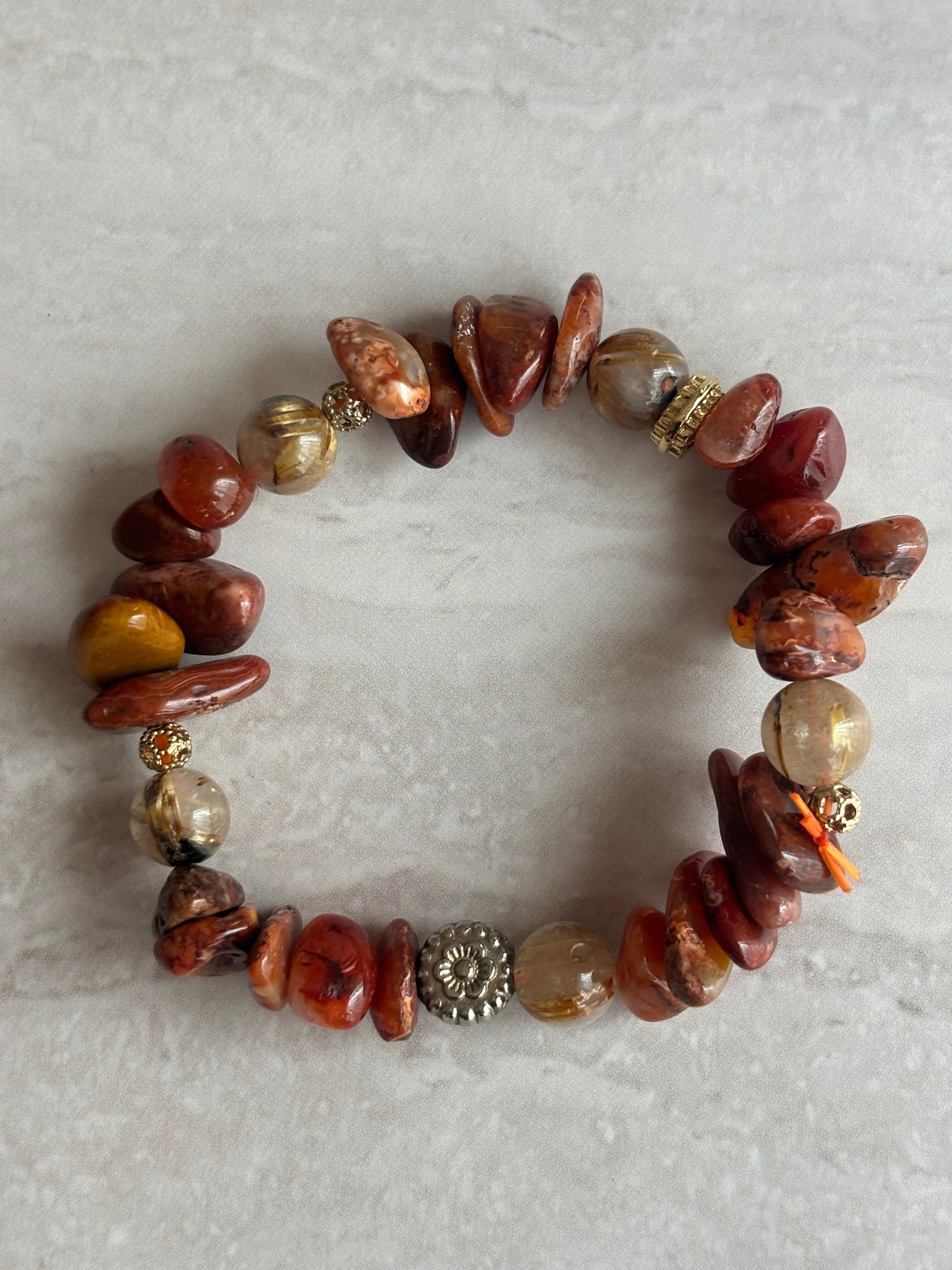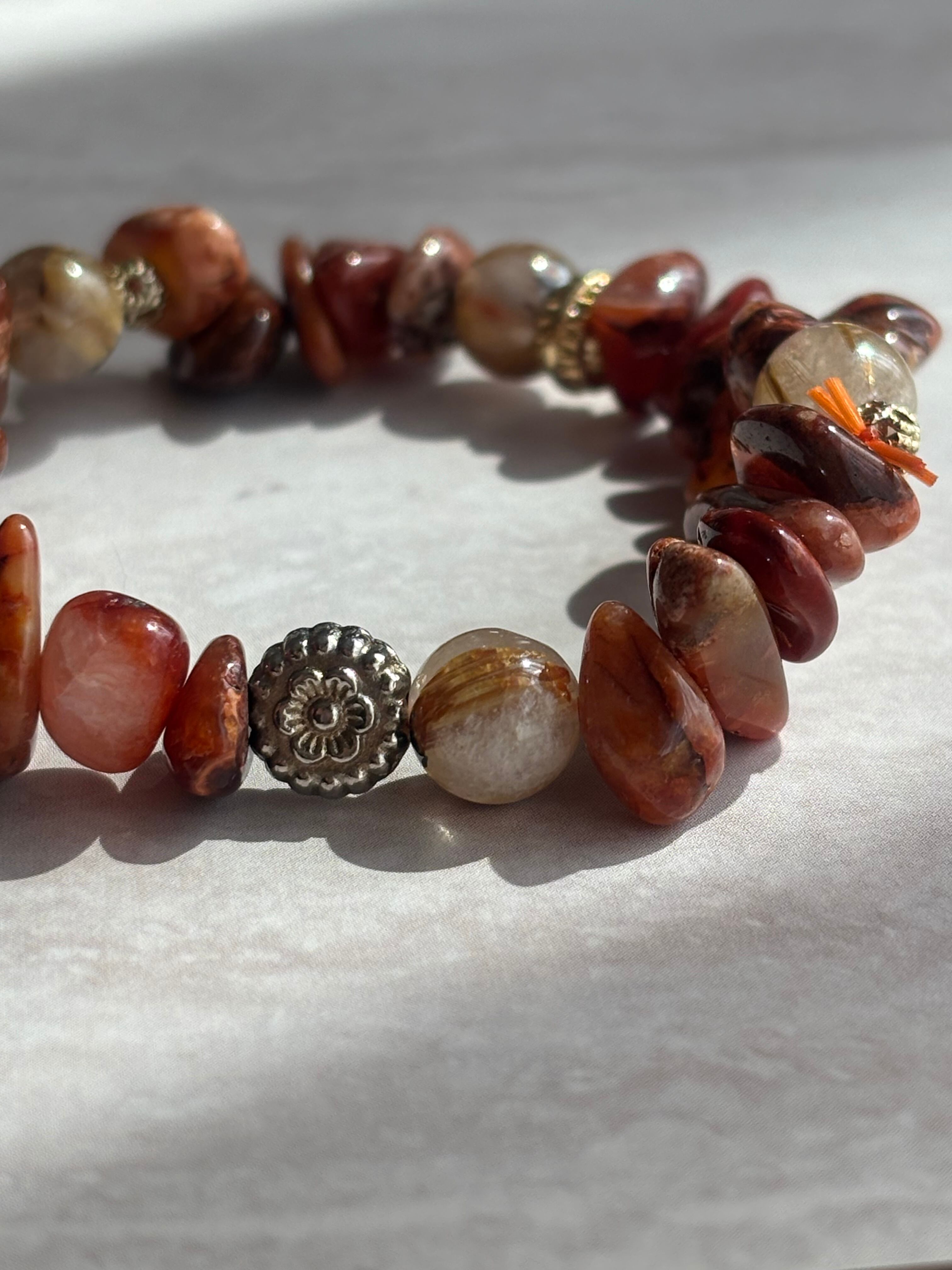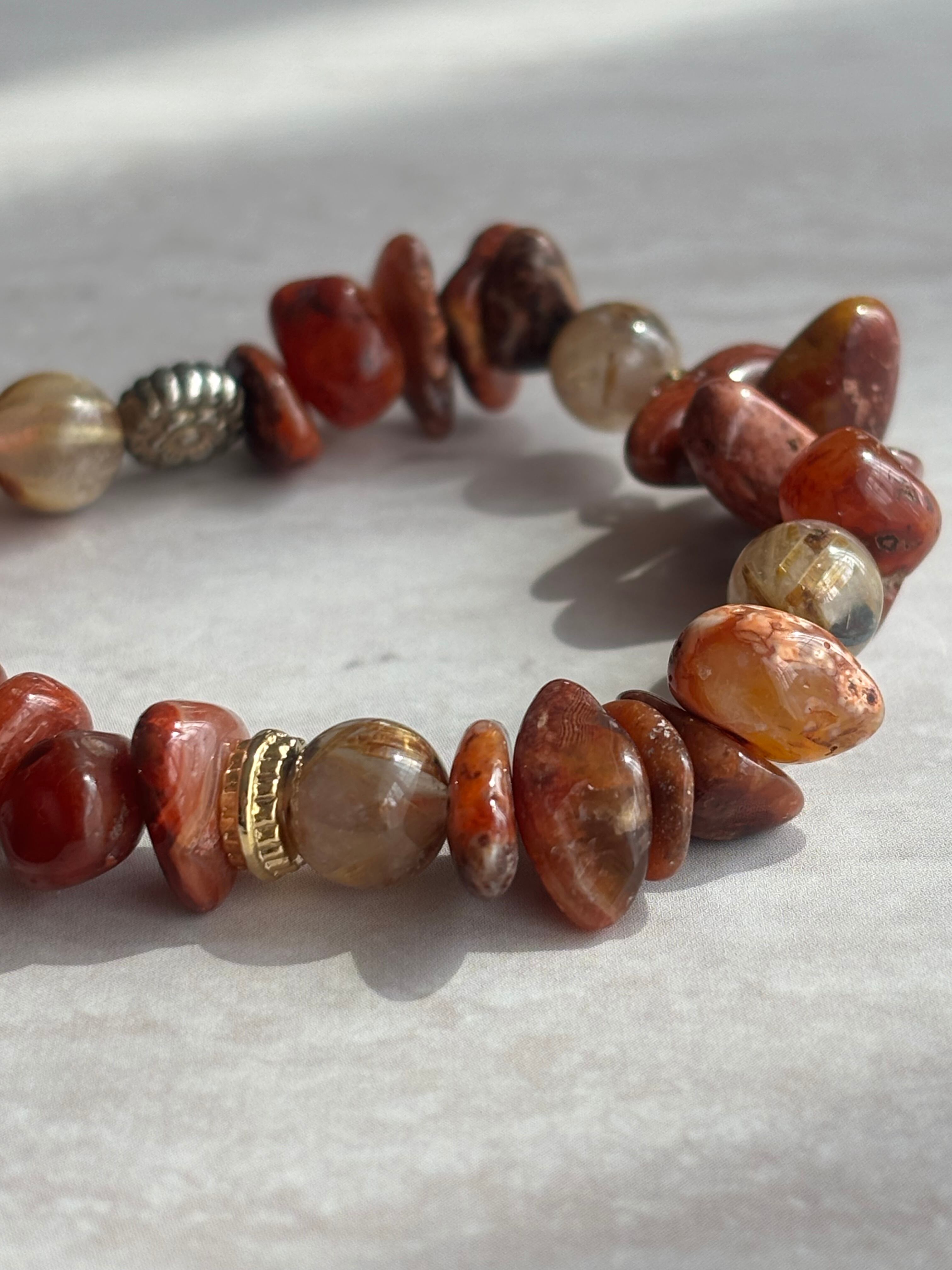 朱色で天然石らしさのあるファイヤーアゲートと、しっかり針の入っているタイチンルチルクォーツ。