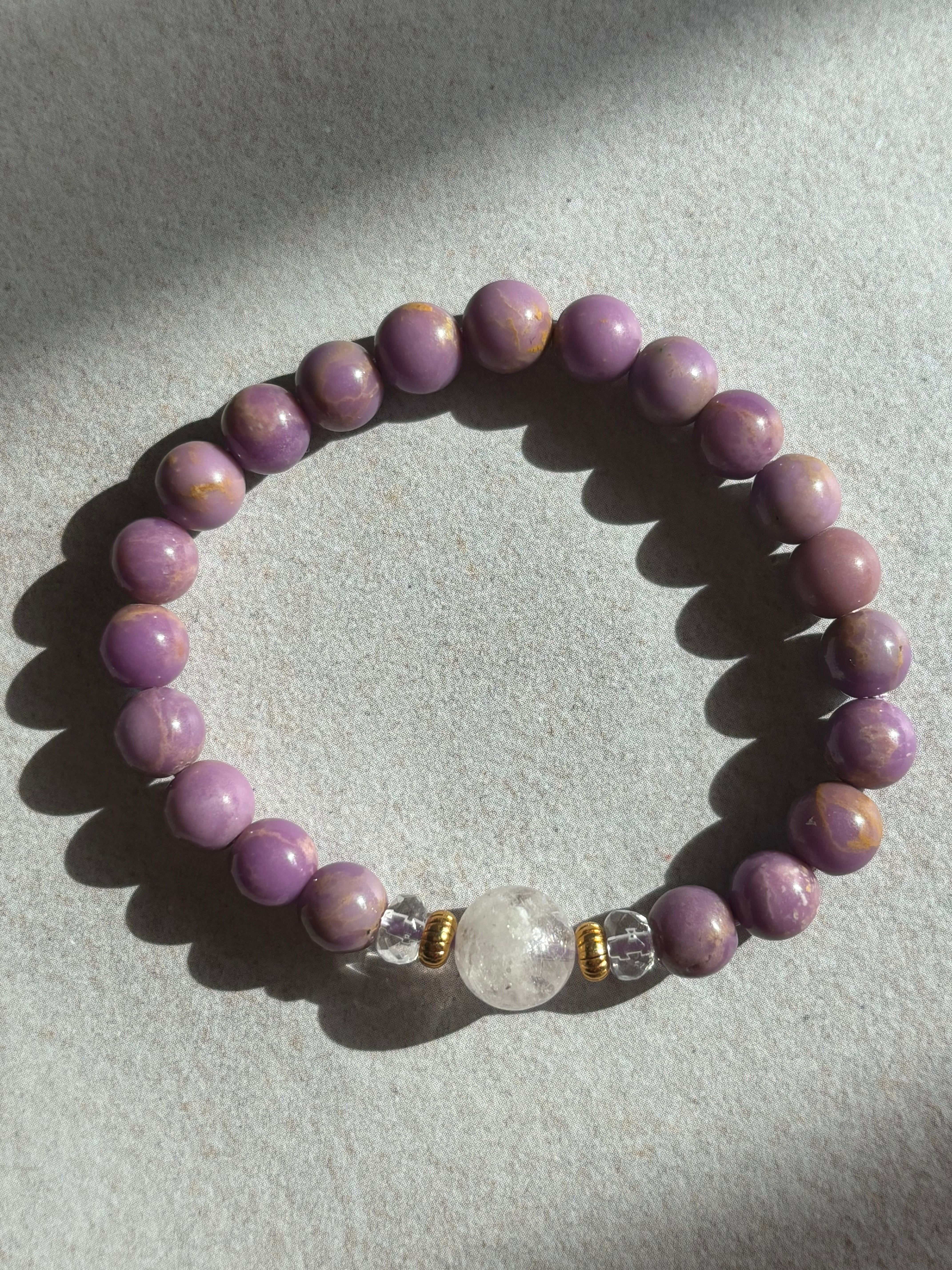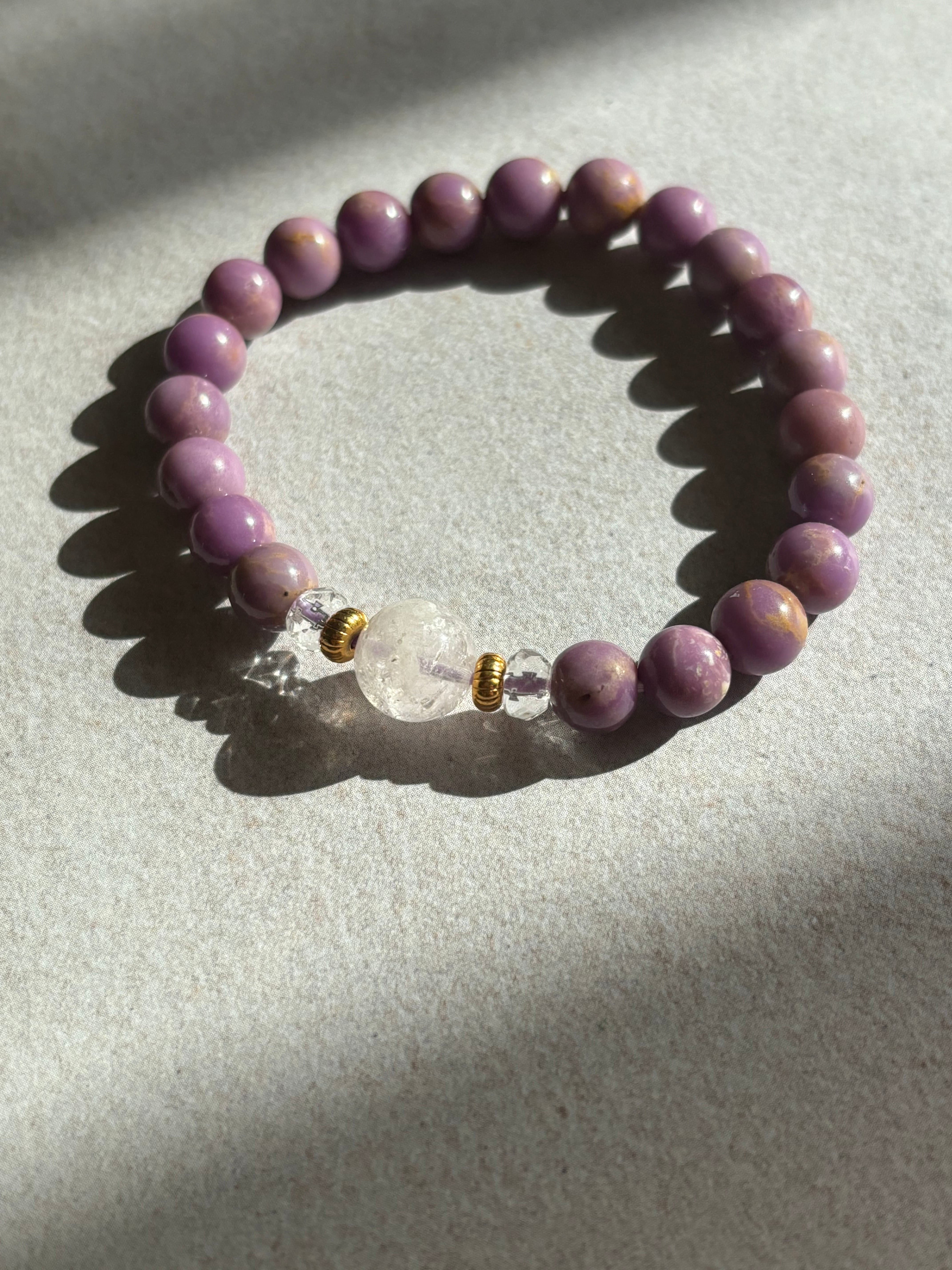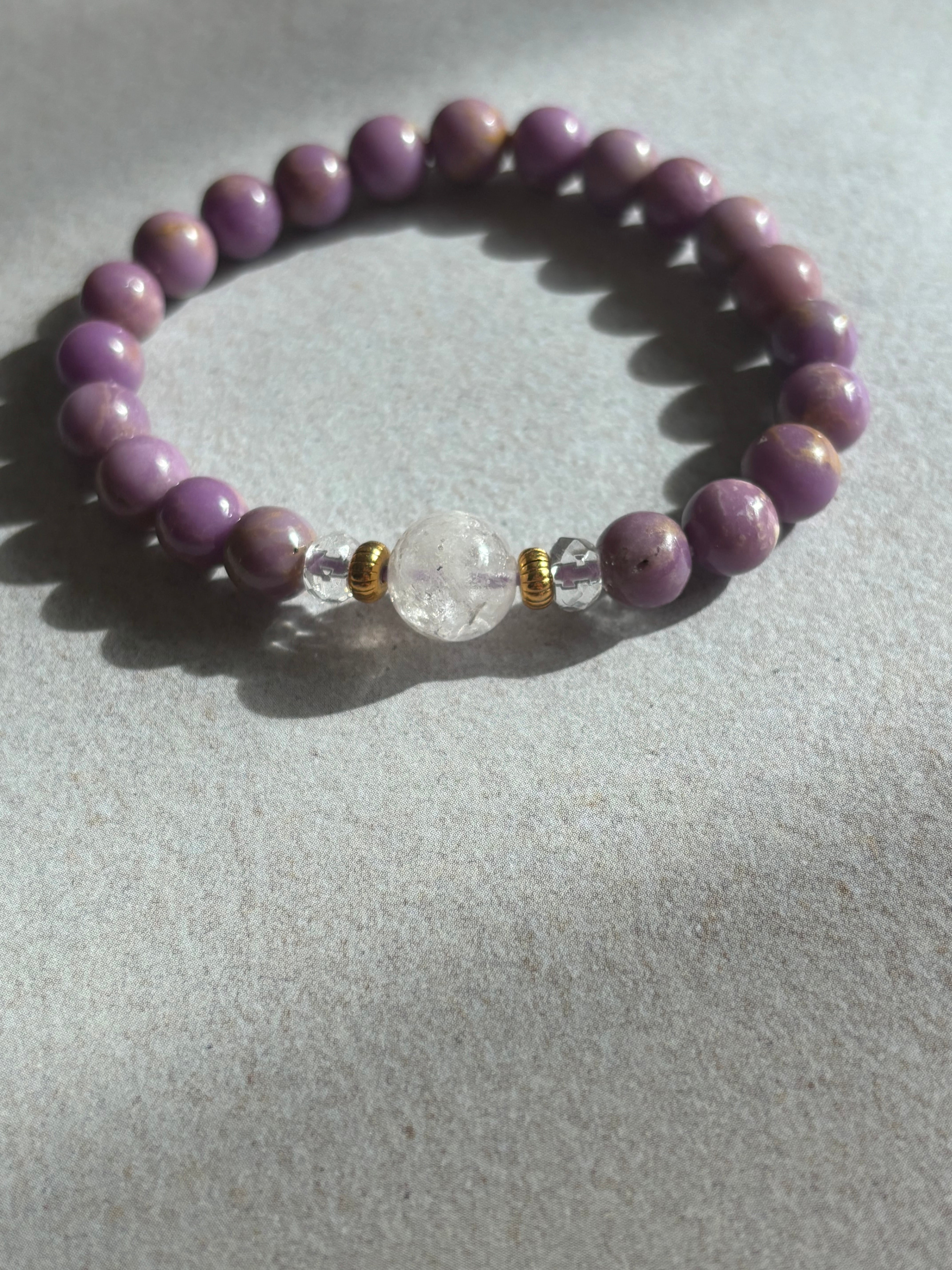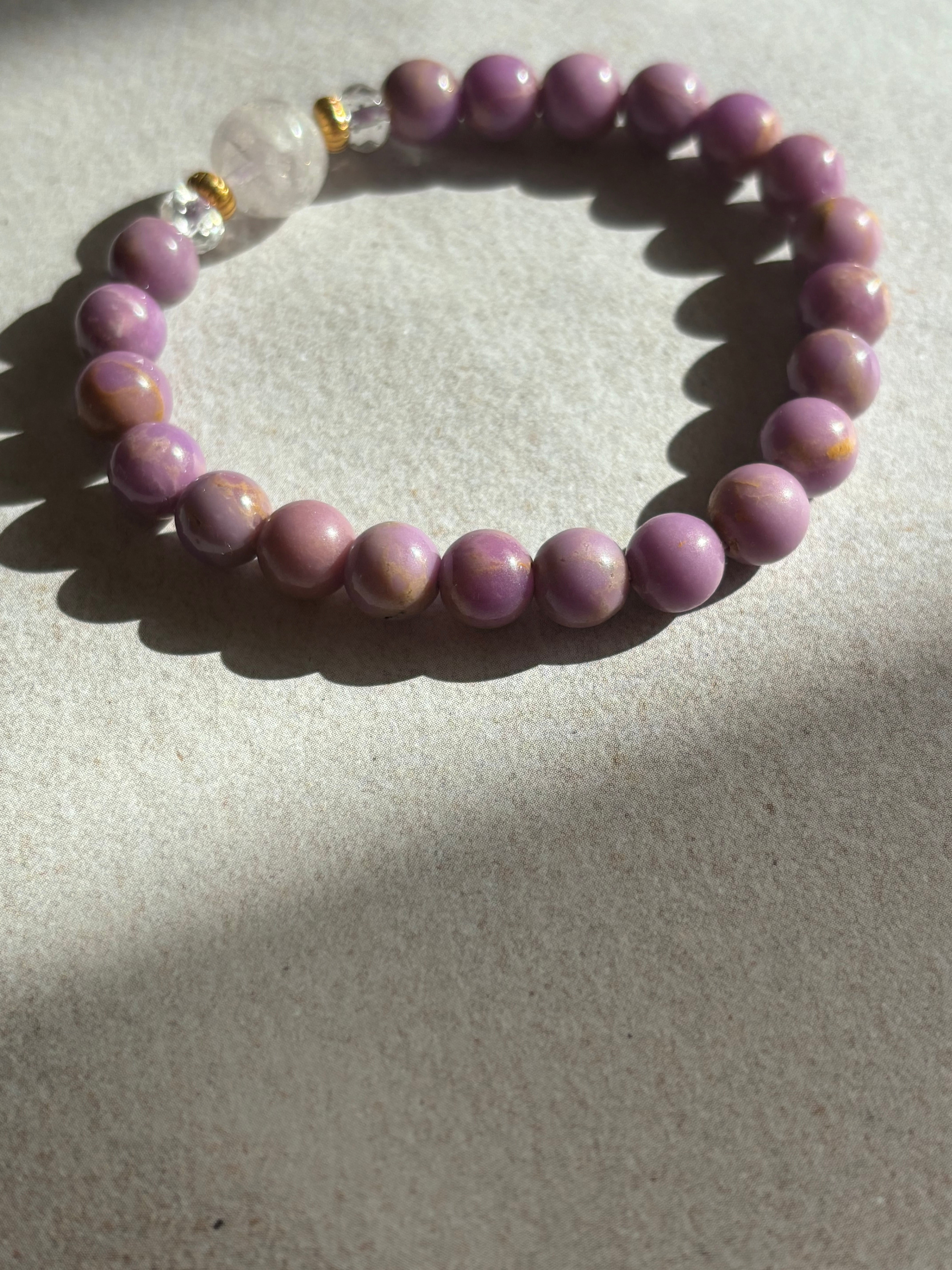 ピンクダンビュライト9.6ミリ フォスフォシデライト約7ミリ 水晶ボタン約3ミリ 究極の「癒しと浄化」のブレスレット サイズ約15センチです。