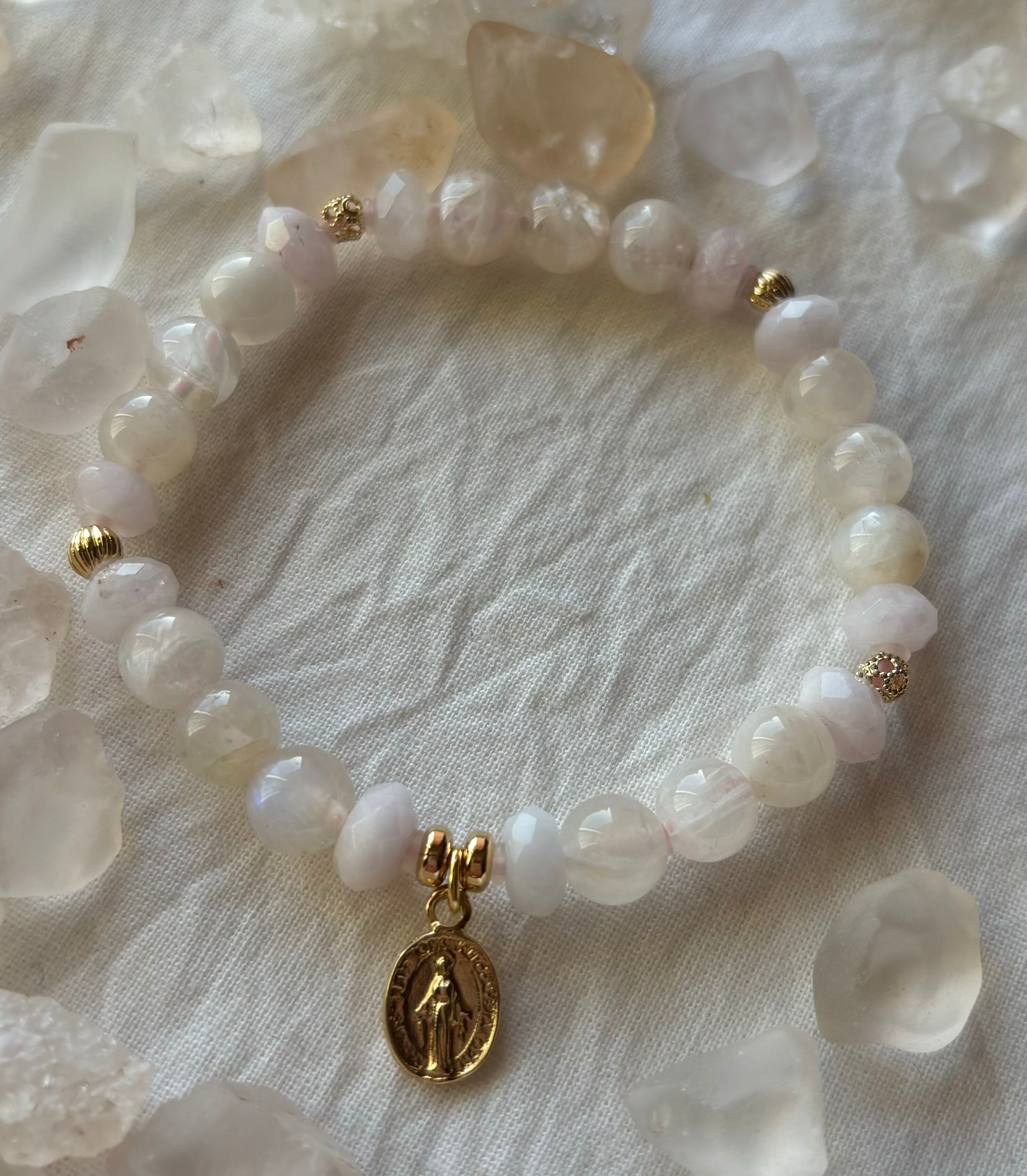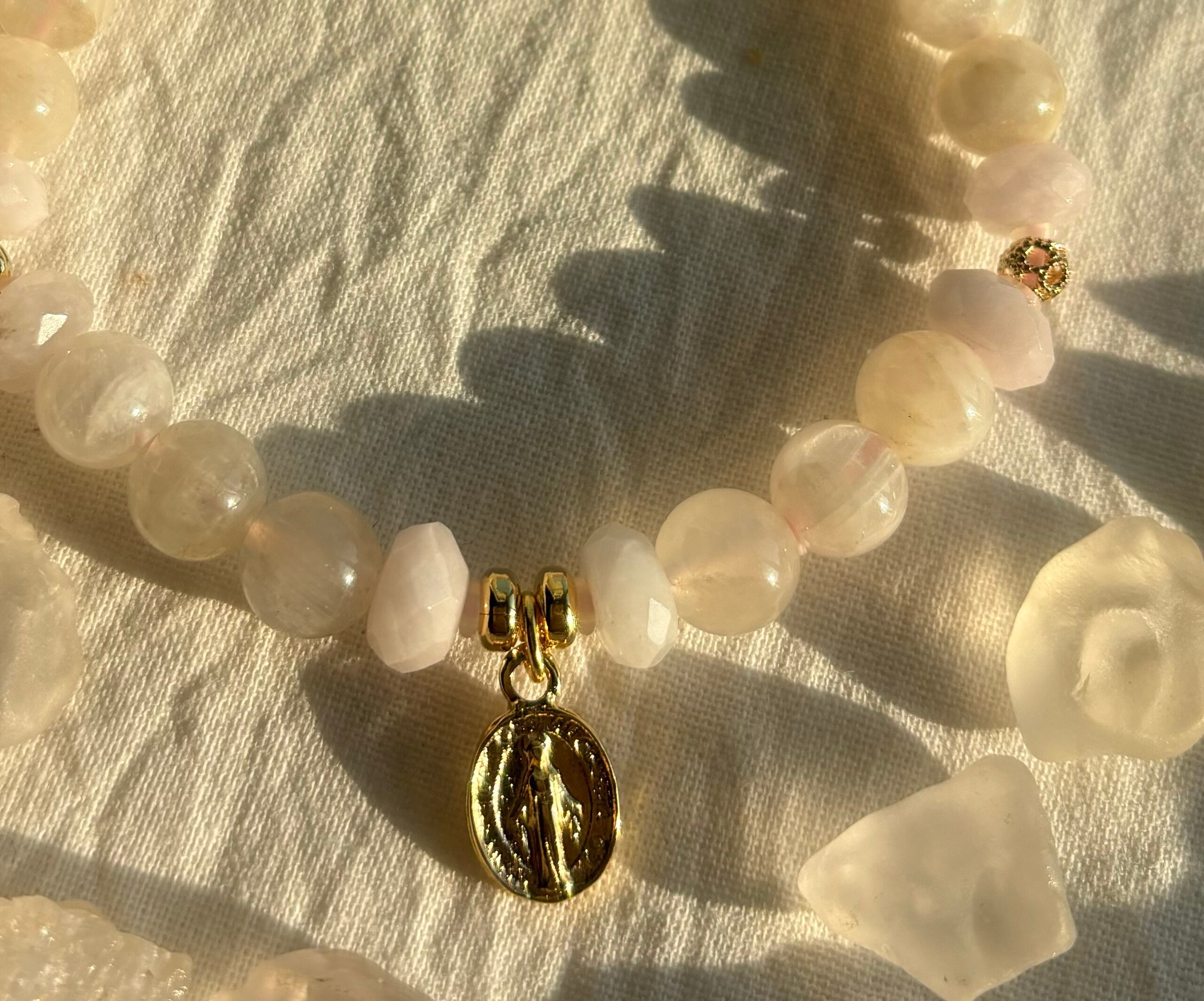 グレームーンストーンとピンクマンガンカルサイトのブレスレット。